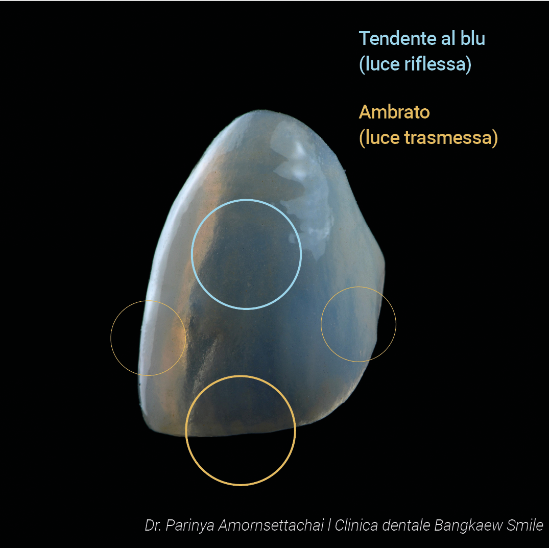 - I denti naturali coperti dallo smalto presentano un’opalescenza caratteristica: appaiono blu se osservati sotto luce riflessa e ambrati se osservati sotto luce trasmessa.