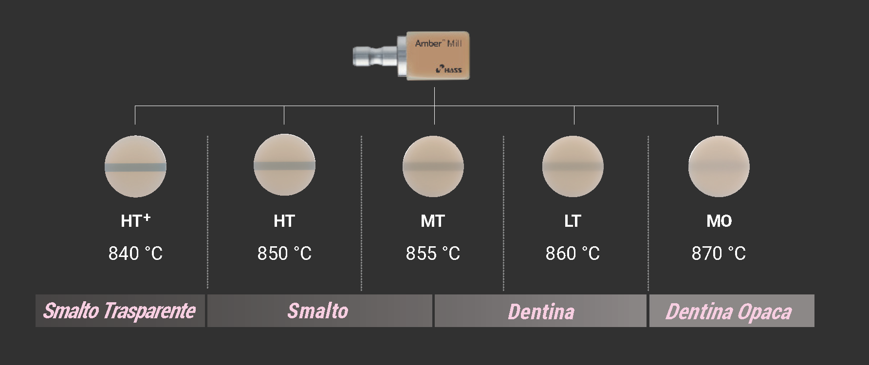 È possibile gestire la traslucenza in maniera personalizzata su un unico blocchetto Amber® Mill. È sufficiente scegliere il colore da utilizzare, di conseguenza selezionare la temperatura di trattamento termico in base alla traslucenza desiderata. In questo modo si migliora l’efficienza del processo di lavoro e la pianificazione delle forniture di blocchetti da fresatura CAD/CAM.